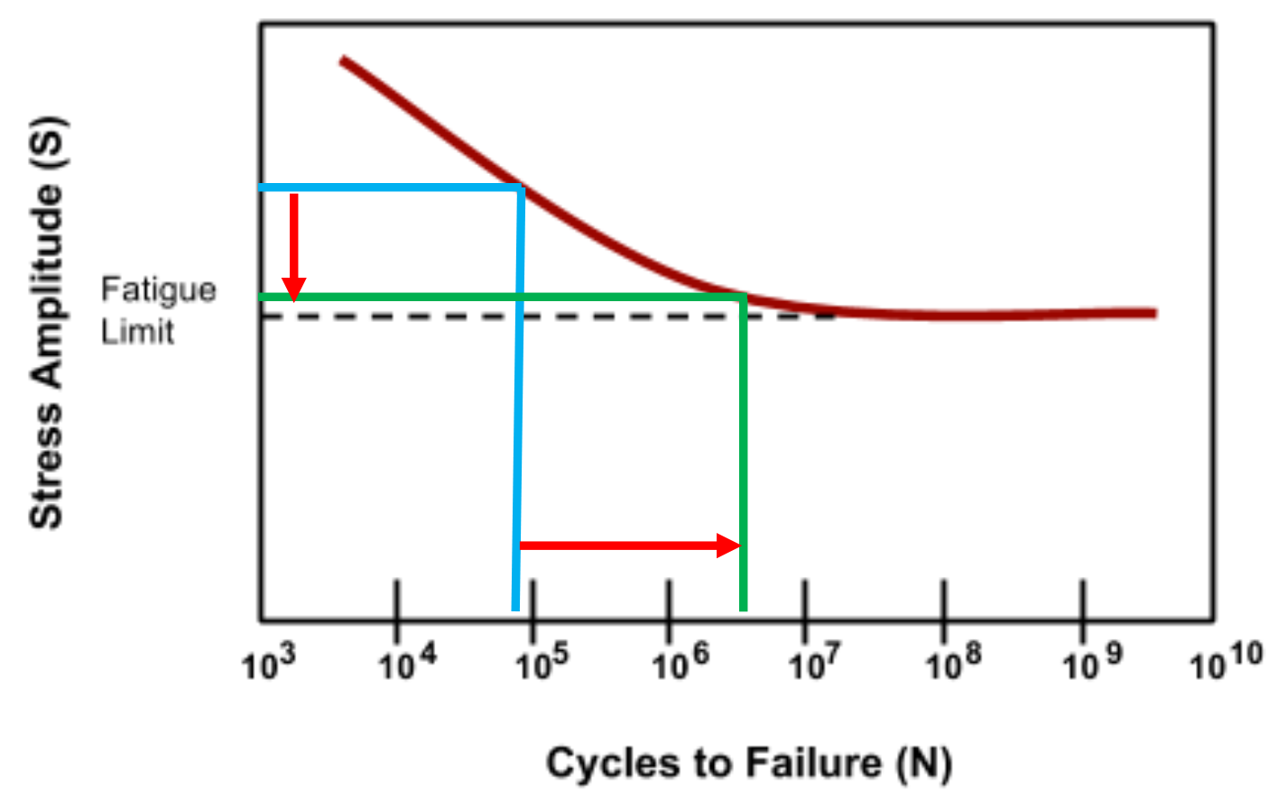 An applied stress above the fatigue limit with sufficient load cycles will eventually lead to failure