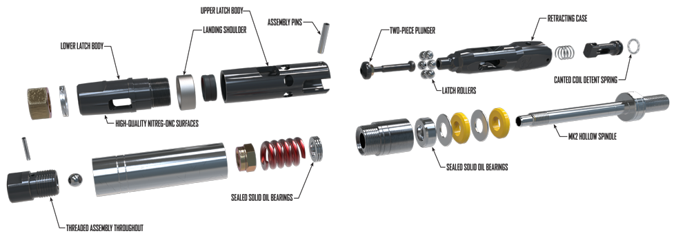 The new overshot allows users to eliminate spearheads and lifting dogs entirely. Lifting dogs experience wear on their latching surfaces with every use, as do the spearpoints. Eventually, the surfaces wear, and the connection fails. Our patented Roller Latch design reduces the chance of release due to wear by ensuring rolling engagement and locking.