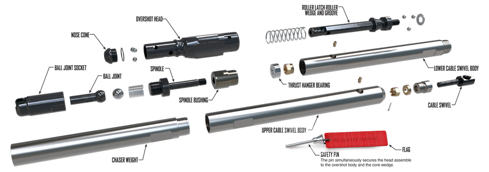 The new Roller Latch pivot design uses past experience to improve the handling of inner tube assemblies. Once out of the rod, inner tube assemblies need to be moved to work areas and laid flat so that the overshot can be disconnected. Having a flexible joint is critical to completing this task safely and quickly.